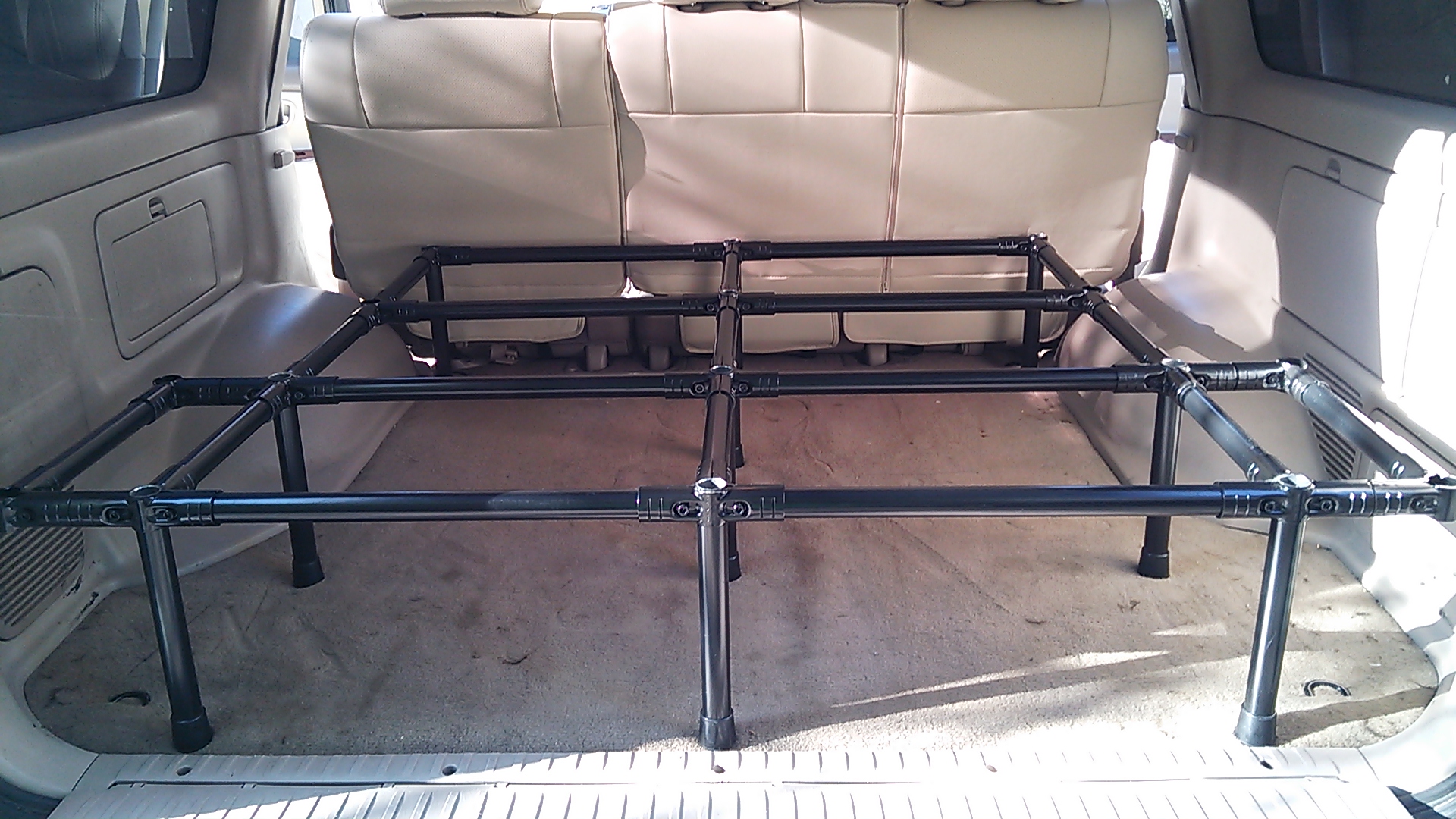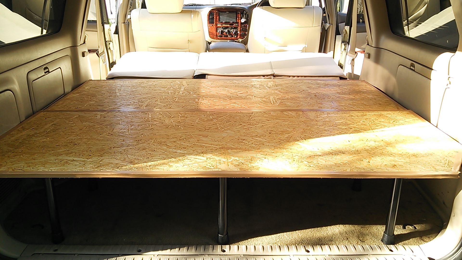 フラットデッキ製作 2015年9月22日 by hide コメントする キャンプで荷物がたくさん積めて、セカンドシートを倒すとフルフラットになるように自作で作った♪既製品もあるのだが高い。矢崎化工株式会社のイレクターパイプで作った。作りはしっかりしていて、大人が載ってもok. DSC_0294 DSC_0298 DSC_0299 DSC_0300